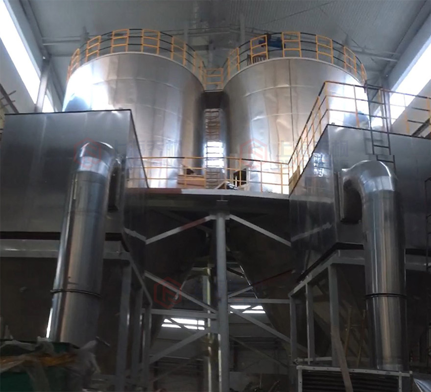 空氣經(jīng)過濾和加熱,進入干燥器頂部空氣分配器,熱空氣呈螺旋狀均勻地進入干燥室。料液經(jīng)塔體頂部的高速離心霧化器,噴霧成極細微的霧狀液珠,與熱空氣并流接觸在極短的時間內(nèi)可干燥為成品。成品連續(xù)地由干燥塔底部和旋風分離器中輸出,廢氣由風機排空。